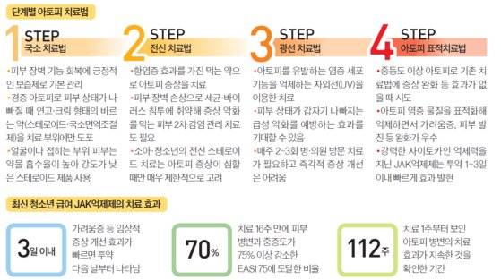 최근엔 강력한 사이토카인 억제력으로 가려움증, 피부 발진 등 피부 증상을 개선하는 먹는 약(린버크 등)에 주목한다. 폭넓은 사이토카인 억제력으로 투약 1~3일 이내 가려움증을 포함한 아토피 증상을 빠르고 강력하게 완화한다. 만 12세 이상 청소년을 포함한 임상 연구에서 아토피 피부염 치료 효과를 평가하는 EASI 75 달성률이 치료 시작 2주 만에 린버크 투약군은 33~38%로, 가짜 약 투약군(4%)과 비교해 유의미하게 높았다. 또 피부 병변과 가려움증 감소 개선 효과도 112주 차까지 유지됐다. 이외에도 성장기 일본 청소년 6명을 대상으로 한 연구에서 키 성장 속도가 정상 범위 이내로 유지돼 약물 투여가 키 성장을 방해하지 않는 것으로 확인했다. 대한아토피피부염학회 손상욱(고려대안산병원 피부과) 회장은 “청소년기 아토피는 유소아기보다 증상이 더 심하게 나타나는 경우가 많아 적극적 관리가 필요하다”며 “민간요법에 의존하지 말고 가능한 한 빨리 전문적인 치료를 받아야 한다”고 말했다.
