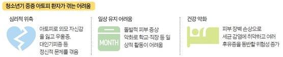 소아·청소년기 아토피 증상은 학업 스트레스, 우울, 과잉행동장애 등 심리적 문제에도 영향을 미친다. 피부 가려움증으로 밤잠을 설치면서 성격이 예민해진다. 피가 날 때까지 벅벅 긁으면서 민감해진 피부에 상처·흉터가 생기고
