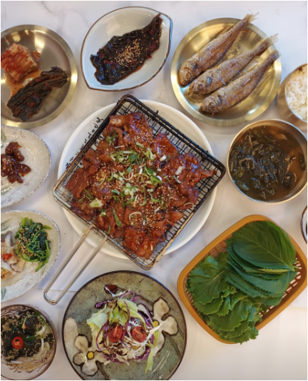 한식당은 간장 또는 양념 석쇠불고기를 메인으로 한 점심 특선 메뉴를 운영하고 있어요. 메인 고기와 함께 다양한 밑반찬, 공기밥, 국, 계란찜까지 더해져 한 상 가득 차려져요. 가격은 13,900원으로, 요즘 외식비를 고려하면 정말 합리적인 편이죠. 밑반찬도 일반 반찬이 아니라 직접 만든 수제 반찬들이라서 집밥처럼 정성이 느껴져요. 특히 깻잎 장아찌나 백김치, 어묵볶음 같은 익숙한 맛이 자꾸 손이 가게 만들죠.