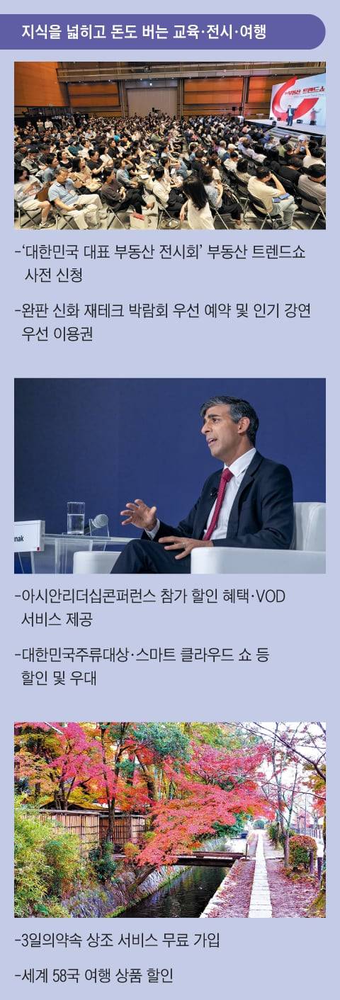 조선멤버십 회원은 ‘대한민국 대표 부동산 전시회’ 부동산 트렌드쇼와 매해 완판 신화를 써온 재테크 박람회를 우선 예약할 수 있습니다. 각 분야 유명 연사 특별 강연 참석권, 한국 대표 명의(名醫)들의 건강 상식 강좌 참여권도 증정합니다.