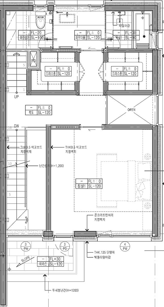 2층은 오롯이 부부만을 위한 공간으로 침실과 테라스, 드레스룸과 욕실이 있습니다.
