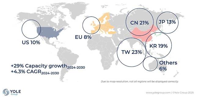 올 상반기 기준 세계 파운드리 시장 점유율은 대만 23%, 중국 21%, 한국 19%, 일본 13%, 미국 10%, 유럽 8% 순이다.