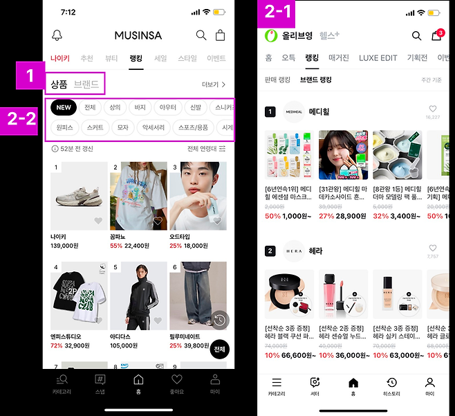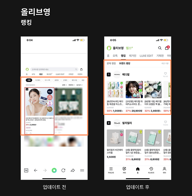 - (1) 올리브영 랭킹 탭과 공통점: 상품 랭킹과 브랜드 랭킹을 구분해서 노출