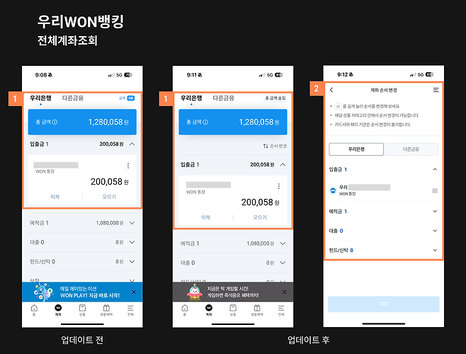 최근 우리은행의 우리WON뱅킹 내 ‘전체 계좌 조회’ 기능이 업데이트되었는데요. 어떤 부분이 달라졌는지 함께 살펴보겠습니다.