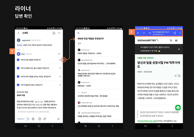 라이너는 질문(요청)을 올바르게 이해하기 위해 질문을 최대한 쪼개고, 답변 역시 신뢰할만한 출처를 바탕으로 제공하고 있어요. 게다가 최초 작성된 답변을 바탕으로 연관된 내용을 확인할 수 있는 질문을 제공해 정보 탐색에 필요한 시간을 줄여주죠.