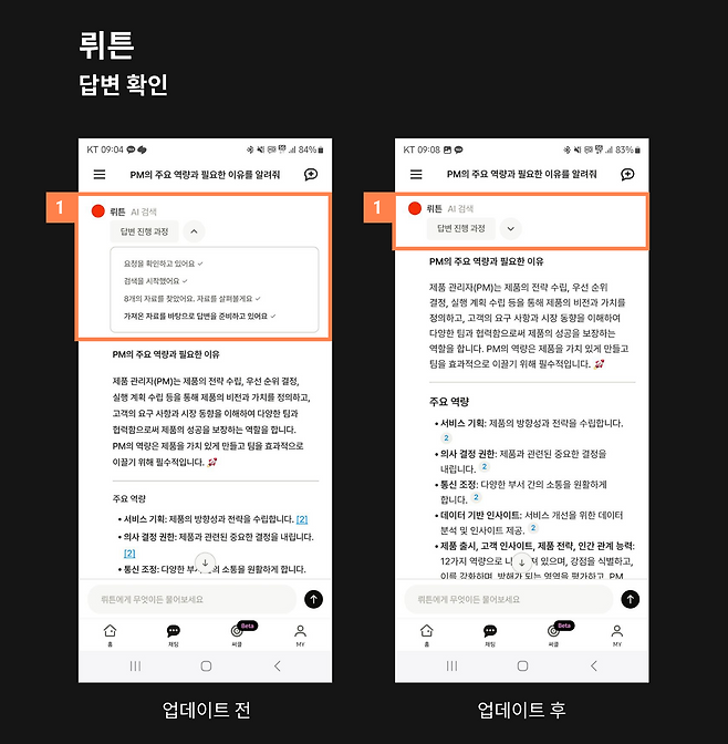 답변 진행 과정은 질문을 할 때마다 확인해봤는데 내용이 크게 달라지지 않았고 (AI 검색에서 답변을 생성하는 방법이 정해져 있기 때문) 기존 구성에서는 답변을 바로 확인하지 못하게 되어 접기를 누른 적이 있어 이런 불편을 해결하기 위해 이번 업데이트를 진행한 것으로 보여요. 아예 없애고 첫 사용 시에만 제공하는 것도 고려할 수 있었을 것 같지만, 기존 검색 엔진에서와 같은 경험이 아니다 보니 신뢰 등을 위해 펼쳐서 확인할 수 있도록 유지한 것이 아닐까 싶네요.