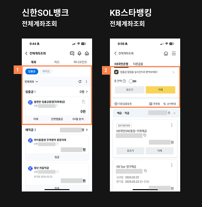 전체계좌조회 기능에 대한 타사 사례도 함께 살펴볼게요. 신한SOL뱅크와 KB스타뱅킹 앱의 사례인데요.