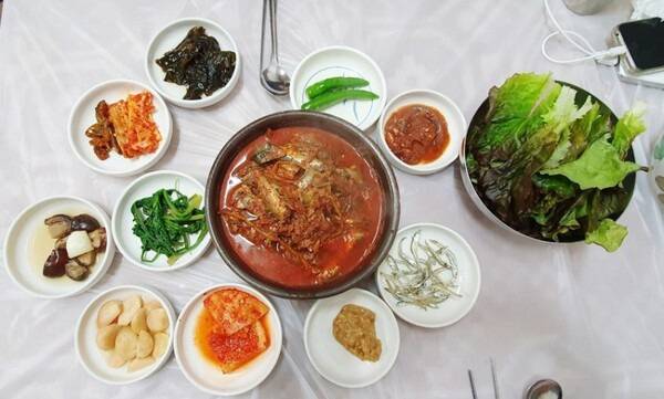가을철 남해에서는 죽방멸치가 제철을 맞습니다. 이 식당에서는 이 고급 멸치를 시래기와 함께 집에서 담근 간장과 된장으로 요리한 멸치찌개를 선보입니다.