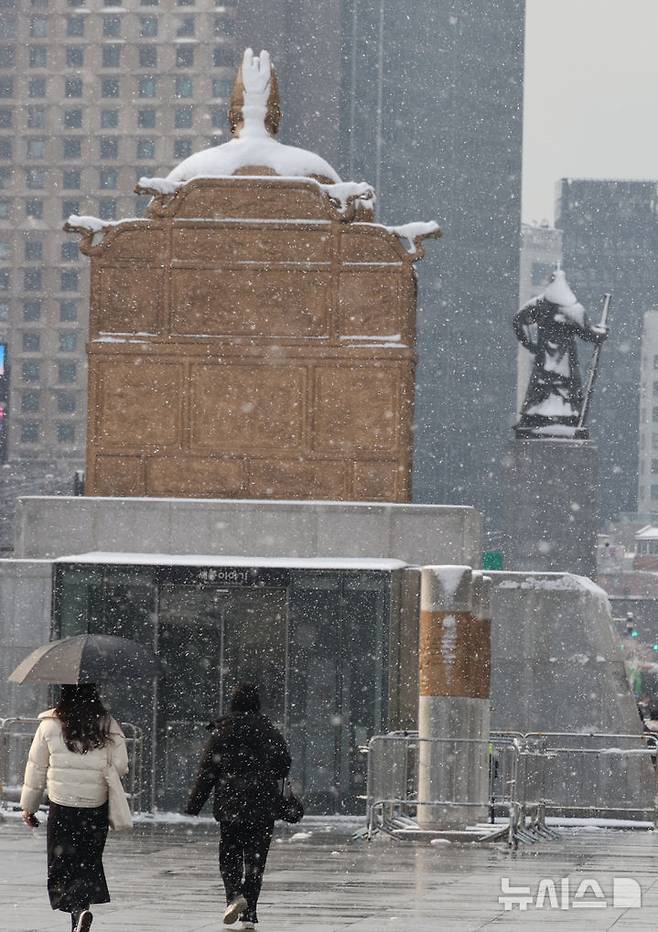 [서울=뉴시스] 김명원 기자 = 새벽부터 내린 눈이 18일 오전 서울 종로구 광화문 광장 세종대왕 동상과 이순신 동상에 쌓여 있다. 2025.03.18. kmx1105@newsis.com