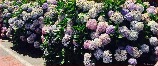 해안도로 양옆에 수국이 활짝 피어나며, 꽃길 위를 걷는 듯한 감성을 선사하죠. 다양한 색의 수국이 바람결에 흔들리는 풍경은 사진으로 담기에도, 마음에 새기기에도 충분합니다.