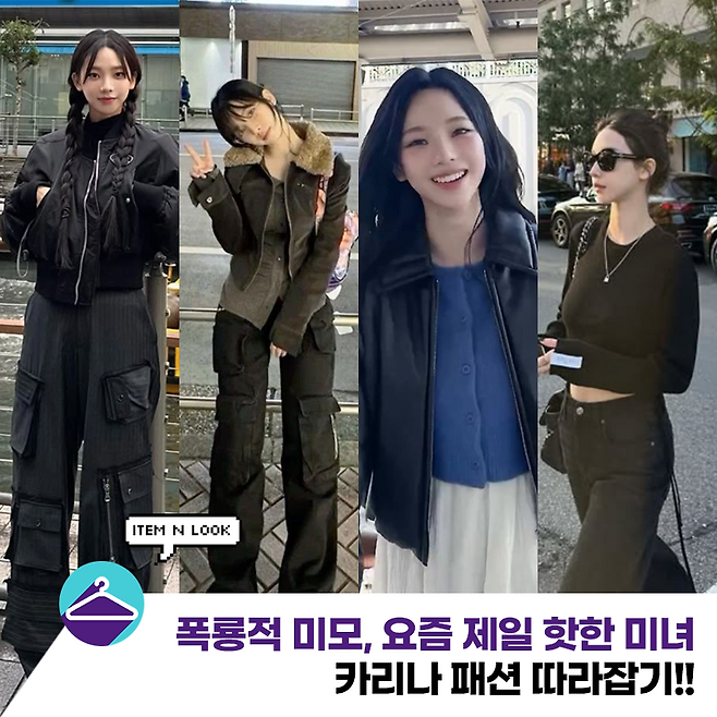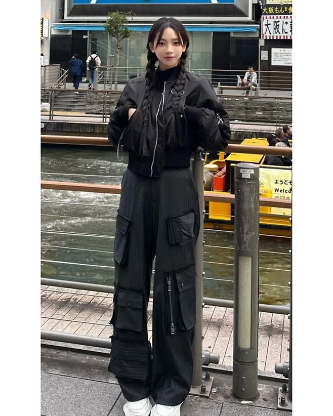 크롭기장의 상의와 펑퍼짐한 하의를주로 즐겨 입는데요, 저 항공점퍼 또한 자주 착용한 템이죠!짧은 스커트도 잘 소화하지만힙한 무드의 블랙 계열 의상을 제일 자주 착용 하는 것 같아요!