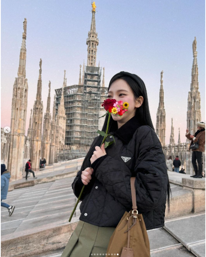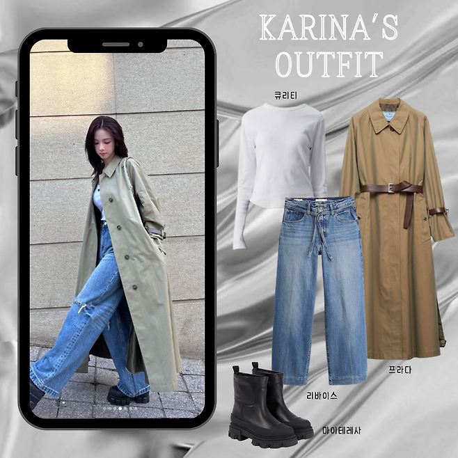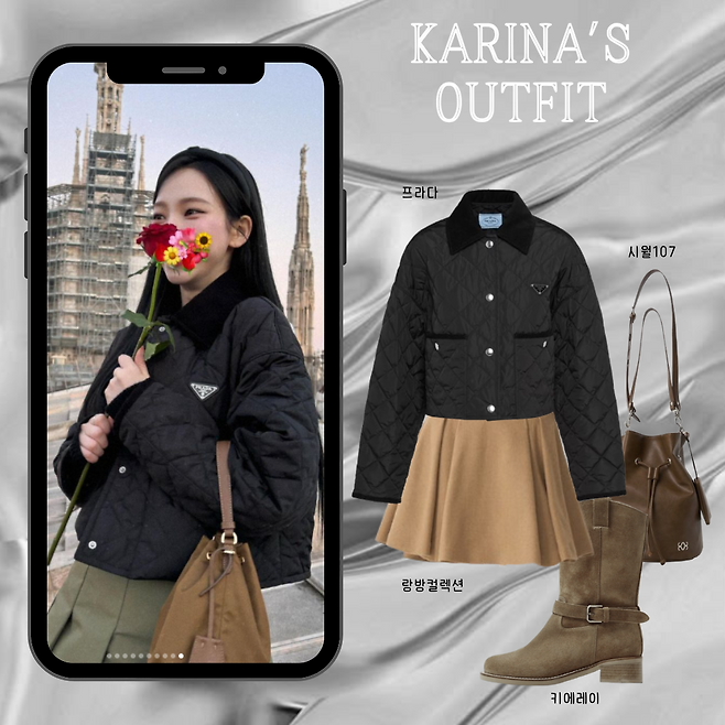 위 사진은 프라다의 제품을 착용한사진들 입니다!백과 아우터 모두 프라다의 제품들 인데요,평소 즐겨 입던 힙한 y2k 무드와는 조금 다르게페미닌 하거나 러블리한 코디가 돋보입니다.카리나 is 뭔들 이겠어요!
