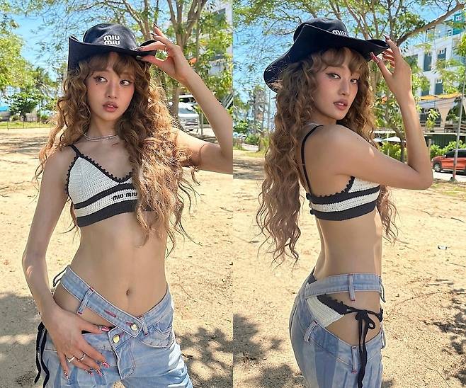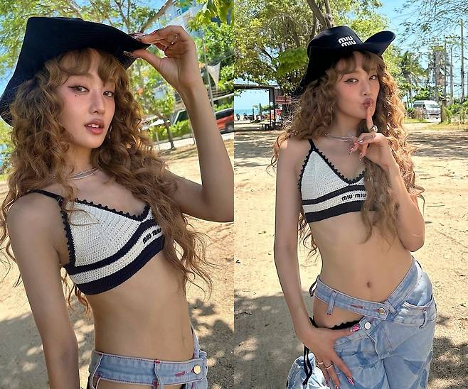 카우보이 모자를 쓴 민니는 청바지 사이로 드러난 비키니로 아찔한 섹시미를 뽐내 시선을 사로잡았다.