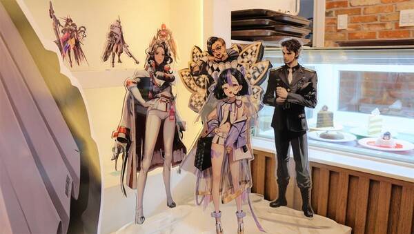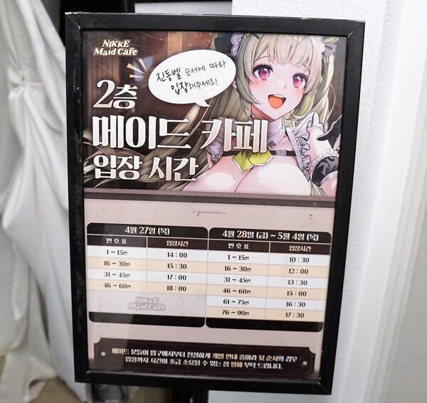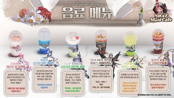 2층 스페셜 메이드 카페에서는 캐릭터 소다·코코아·에이드로 분장한 실제 메이드들을 만날 수 있으며, 귀여운 서비스도 함께 제공됩니다. 이 메이드들은 게임 내에서 발렌타인 이벤트 때 등장했던 니케들이에요.