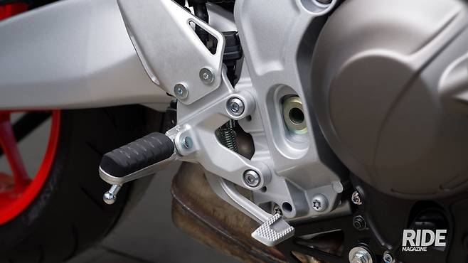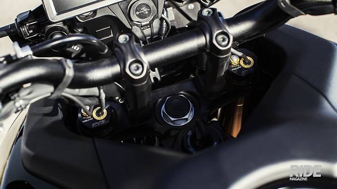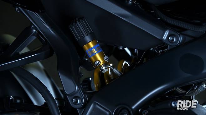 또한 앞 KYB 조절식 포크와 뒤 올린즈 모노 쇼크 업소버 조합의 서스펜션도 SP 사양에만 적용된 것이다. KYB 포크는 41mm 직경에 골드 마감 및 DLC 코팅 처리됐으며, 스프링 계수를 더욱 높여 스포티한 주행에서도 뛰어난 안정성을 제공하고, 댐핑 특성을 개선해 승차감을 향상시켰다. 또한 압축, 신장, 예압 등 모든 설정을 변경할 수 있어 상황이나 취향에 따라 설정을 세밀하게 조절할 수 있다. 올린즈 모노 쇼크 역시 압축과 신장 감쇠력을 조절할 수 있으며, 별체식 프리로드 조절 장치가 추가되어 상황에 맞는 빠른 대응이 가능하다.