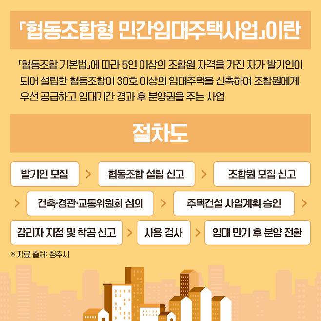 ‘협동조합형 민간임대주택’이란 협동조합기본법에 따라 설립된 협동조합이나 사회적협동조합이 조합원들을 대상으로 민간임대주택을 공급하는 사업을 말합니다.