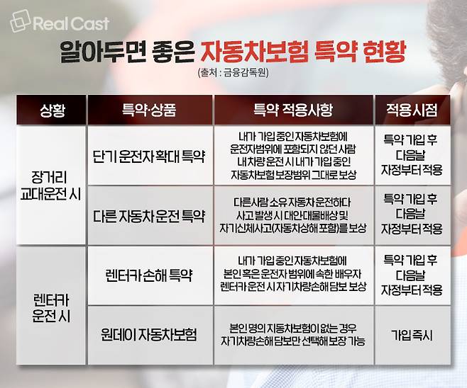 16일 금감원은 안전 운전을 위한 유의 사항부터 교대 운전 및 침수사고를 대비한 특약 소개 등 알아두면 유용한 자동차보험 정보를 안내했습니다.