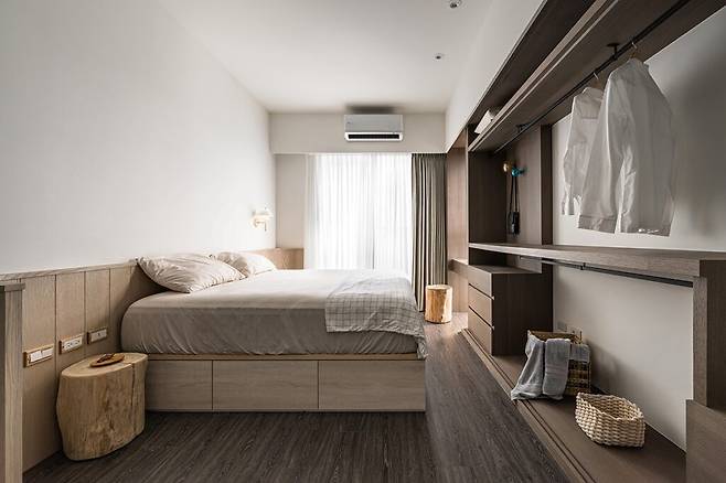 여백의 미를 강조한 침실은 간결한 가구와 원목의 따뜻한 색조 덕분에 경건한 분위기를 연출한다. 천장 아래 옷장은 철제 걸이와 서랍장을 결합한 실용적인 디자인으로, 시선을 분산시키지 않는다. 침대 헤드는 아치형으로 둘러싸여 아늑한 느낌을 주며, 벽 조명과 앤틱 스타일의 원형 탁자가 차분한 리듬을 형성한다.