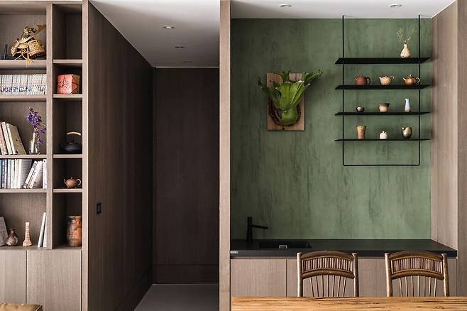 문을 열고 들어서면 단순한 입구가 아닌, 고대 건축의 그림자 벽 개념을 살려 풍수의 흐름을 고려한 공간이 펼쳐진다. 손으로 섬세하게 덧입힌 먹색 벽면은 이끼가 낀 듯한 질감을 고스란히 드러낸다.
