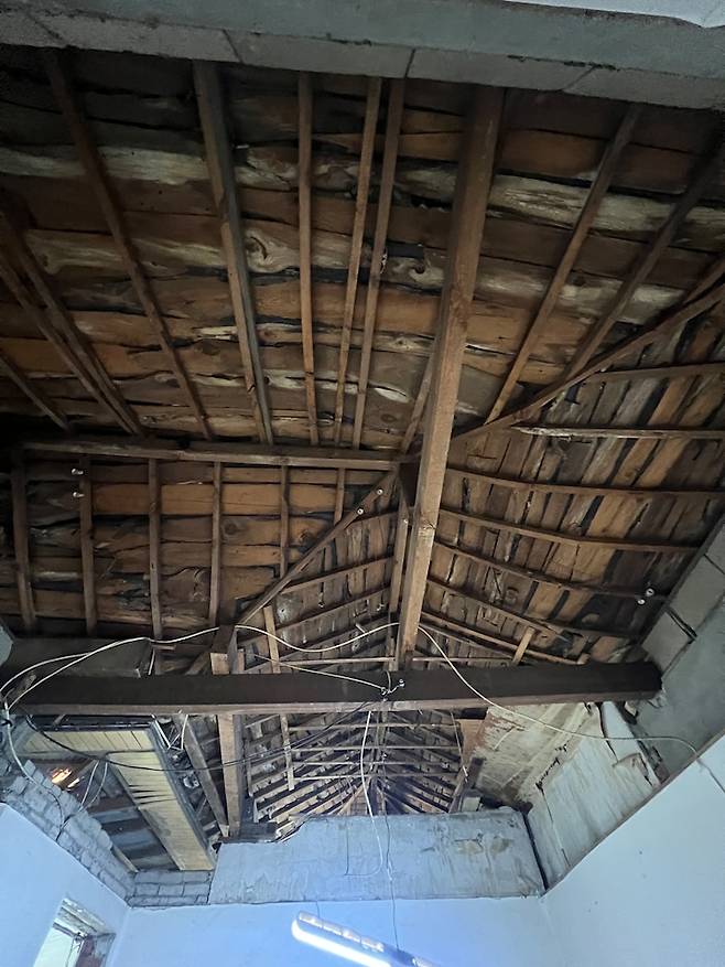 두번째 천장까지 철거하고 보니 지붕의 나무가 다 썩어 있었어요.