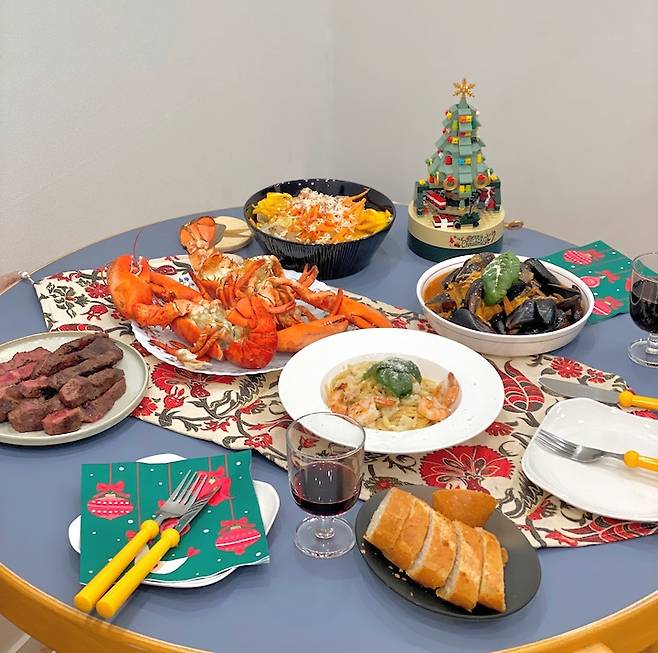 크리스마스 시즌에는 크리스마스 패턴 패브릭을 깔고 점심에는 팬케이크, 저녁에는 나름 열심히 요리를 해서 오붓하게 파티를 했어요.