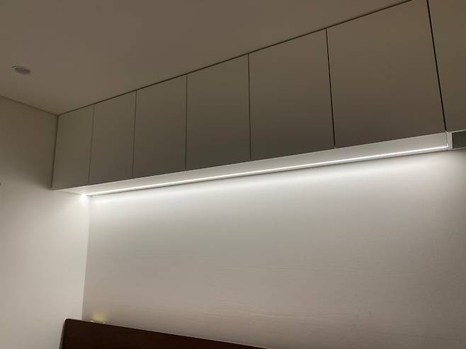 침대 위 상단 수납장을 만들고 수납장 아래 간접등을 둬 은은한 불빛을 낼 수 있게 했는데요, 요 수납이 정말 요긴하게 쓰이고 있어요.