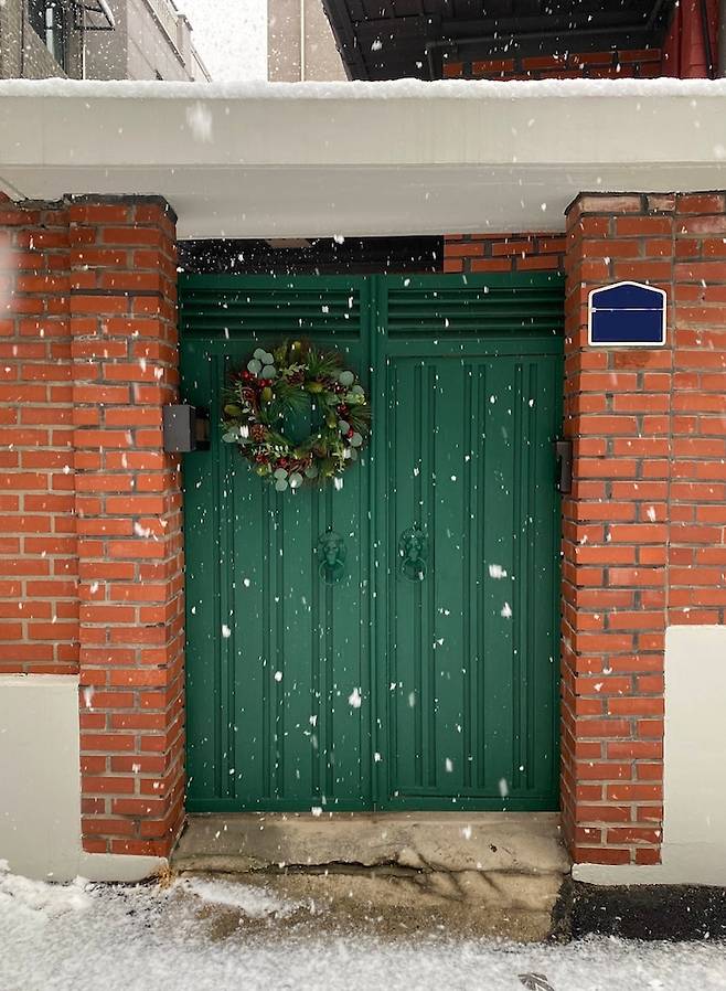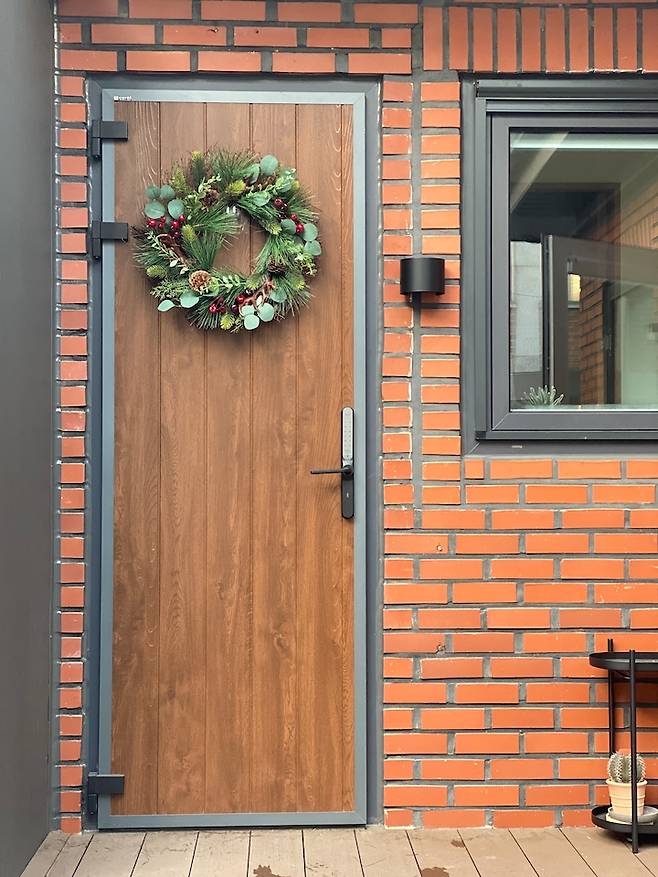 겨울에는 현관문에 크리스마스 리스를 장식했어요. 전체적으로 붉은 톤에 초록색 리스를 걸으니 참 예쁘죠!
