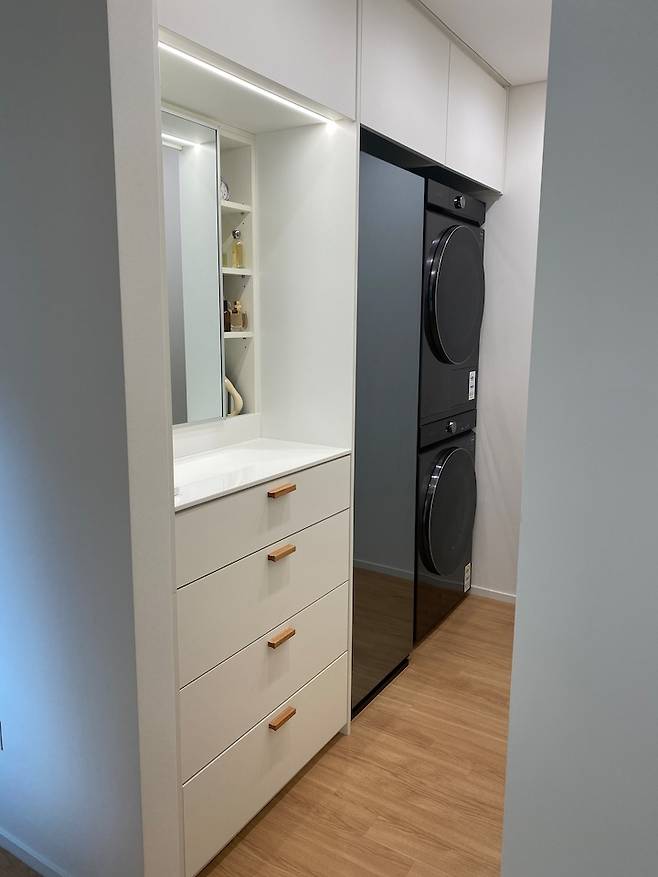 우측에는 화장대와 서랍장, 에어드레서 세탁기 건조기가 설치되어 있어요. 이 공간에 창문이 따로 없고 문이 불필요하다 생각하여 문은 생략했어요.