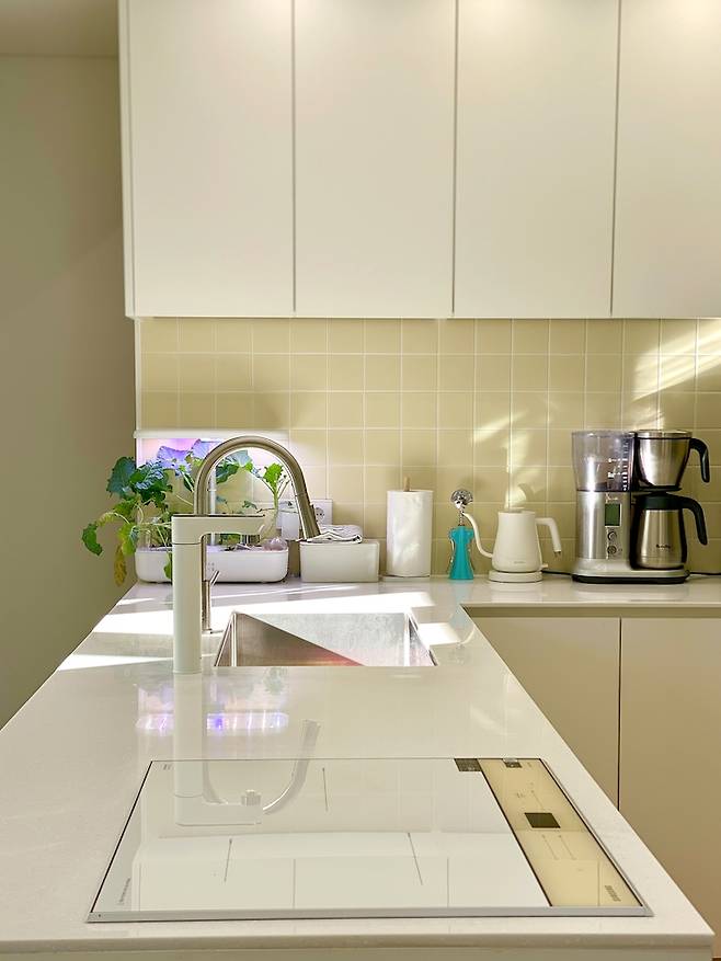 주방의 포인트는 버터색 타일과 버터색 (바닐라 컬러)의 전기 인덕션인데, 어쩜 이렇게 색깔이 잘 맞는지! 설치하고 나서 물개박수를 쳤던 기억이!!