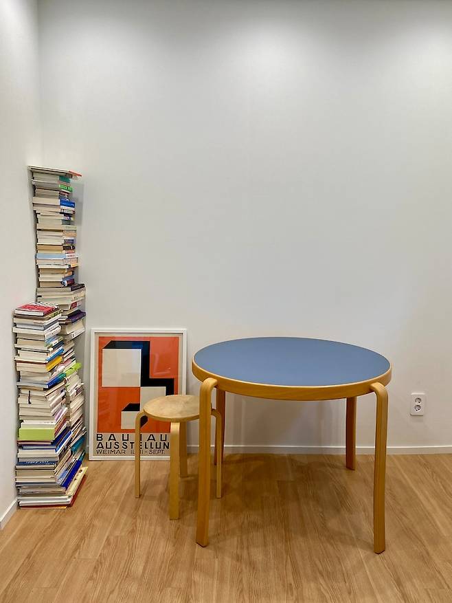 반대편 공간에는 식탁과 책을 쌓아뒀어요. 아직 책장을 구매하지 못해서 이렇지만 나름의 느낌이 있네요. 아직 테이블에 의자를 사지 못했어요.