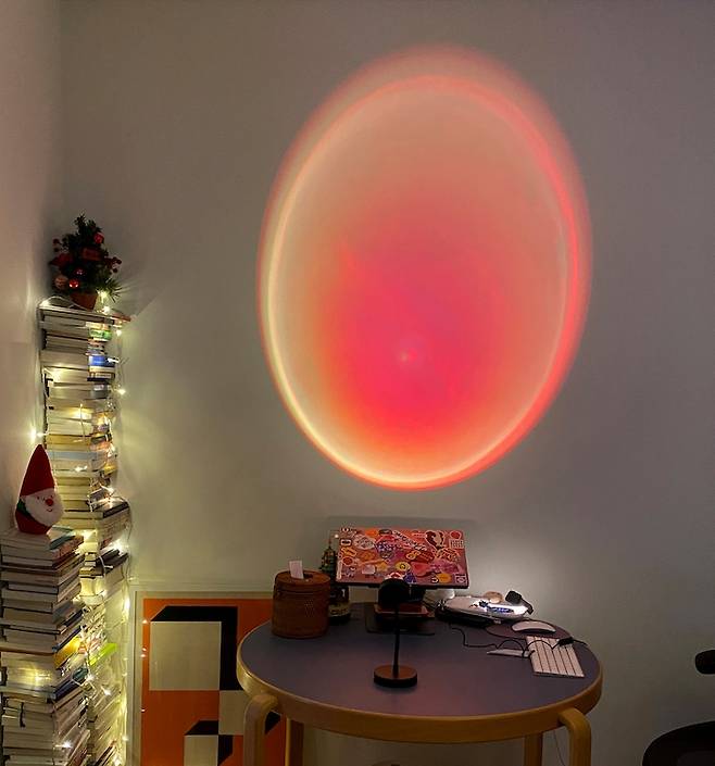 그리고 저녁에는 책 트리에 조명과 빈 벽에는 예전에 사둔 선셋 조명 키고, 카운트 다운을 외치며 둘이서 오붓한 파티 타임을 갖았어요!
