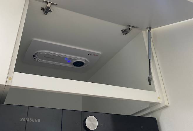 건조기 천장 쪽에 강력한 환풍기를 설치해서 환기를 하고 있어요. 상단이 수납장처럼 생겼지만 2칸은 사실 수납장이 아니라 가려주는 역할이랍니다.