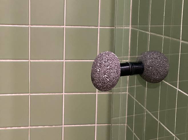 샤워부스의 문고리를 스테인레스가 아니라 귀여운 돌로 선택했더니 욕실이 귀여운 느낌이 됐어요.