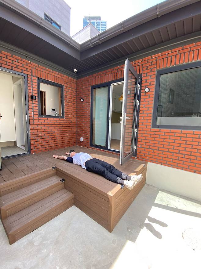 공사 완료 후 첫 집 방문때 너무 기분이 좋아서 남편이 데크에 쭉!! 누웠어요.