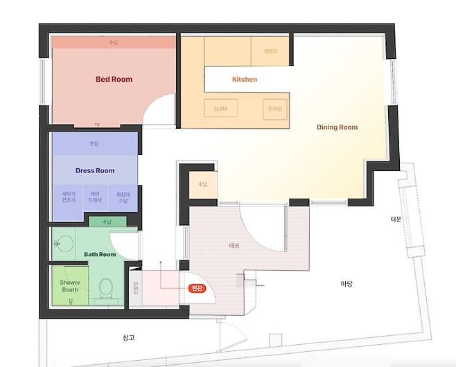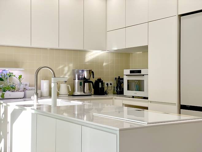 저희는 둘 다 요리를 좋아해서 넓은 주방을 원했는데요, 설거지나 요리할 때 벽을 보고 하지 않고 이야기 하면서 하기 위해 ㄷ자 형태에서 마당이 보이는 위치에 뒀어요. 확실히 오픈 키친이라 요리할 때 이야기하면서 하고, 또 눈이 오거나 비가 올 때 밖을 보면서 요리를 하면 기분이 정말 좋아요.
