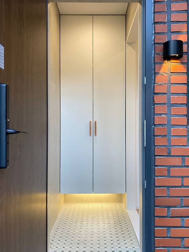 현관에 들어섰을 때, 외관과 다른 초록의 컬러 모자이크 타일로 포인트를 줬어요. 집의 장점 중 하나인 층고가 높은 것 덕분에 신발장의 수납력이 좋아요. 그리고 신발장 하단에 간접등을 둬 밤에도 따뜻한 느낌과 신발을 잘 찾을 수 있어요.