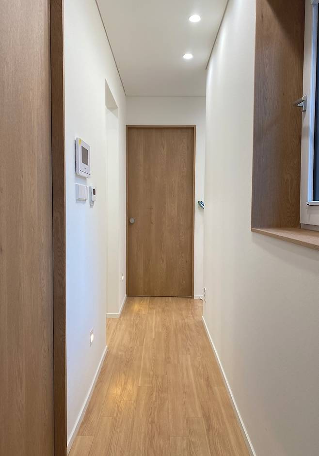 복도에는 창문이 있어서 화장실과 드레스룸의 공기를 환기시켜주는 역할을 해요. 바닥과 문은 중간톤의 우드로 편안한 느낌을 줬어요. 저희는 중문이 없어요. 지금은 별이 된 우리 할아버지 강아지가 드나들기 쉽도록 복도 다음 바로 현관으로 설계했어요.