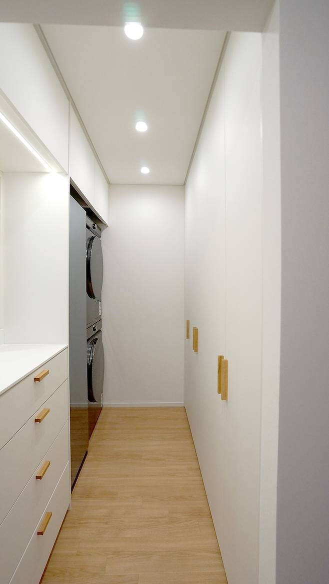 기존에 1개의 큰 방을 잘라 안방과 드레스룸 공간으로 나눴어요. 이 공간에는 에어드레서과, 세탁기, 건조기 등 옷에 관련된 것들이 있는 공간이에요.
