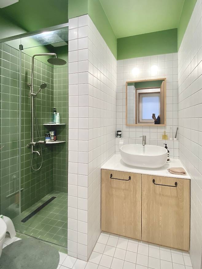 샤워부스는 무관 수전과 올리브 컬러의 모자이크 타일로 되어있어요. 욕실에는 단차를 둬 독립공간을 만들었어요