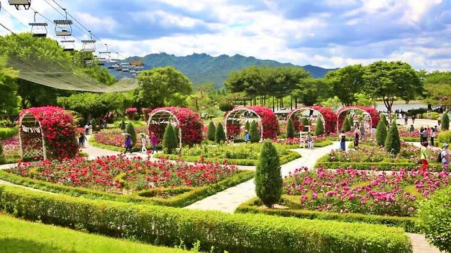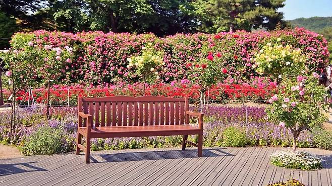 테마가든 내에 조성된 장미원은 프랑스식 문양 정원이 인상적인 1단지부터, 가제보와 라벤더가 조화를 이루는 2단지, 흔들의자와 덩굴장미가 매력적인 3단지, 신화 속 조각상과 영국식 장미가 어우러진 4단지까지 네 개의 구역으로 구성돼 각각 다른 매력을 뽐낸다.