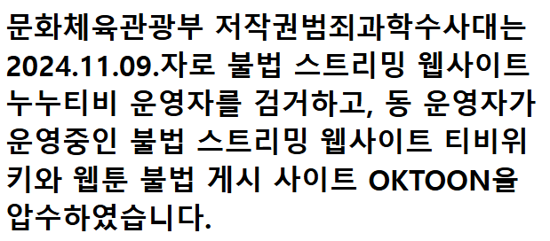 2024년 11월 9일 오후, 많은 네티즌들이 주목하던 가운데 티비위키 웹사이트에 올라온 공지를 통해 불법 스트리밍 사이트 운영자 검거 소식이 전해졌습니다.
