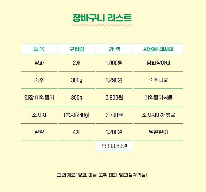 특별한 식재료가 아니어도 든든한 한 끼 밥상을 차릴 수 있습니다. 만원부터 4만원까지 예산별로 식단표를 짜고 싶다면 지금 바로 「일주일 식비 절약 반찬 만들기」 를 서점에서 만나보세요!