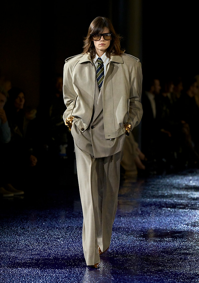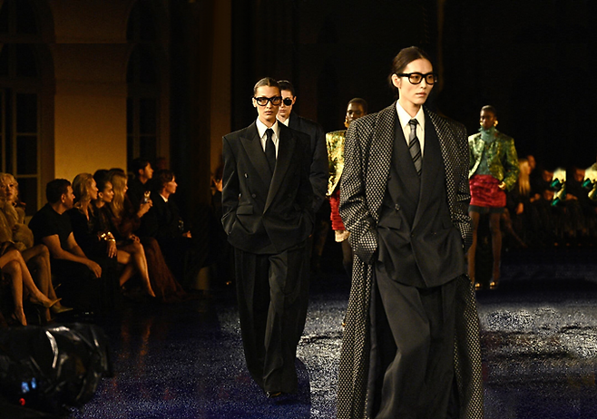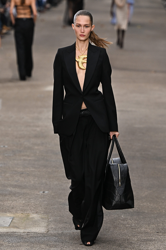 생 로랑은 에펠탑 앞을 벗어나 리브 고슈의 본사 건물로 돌아와 60년대 입생로랑의 '르 스모킹(le smoking: 턱시도)' 슈트에서 영감을 받은 80년대의 파워 숄더룩으로 웅장한 런웨이를 선사했다.