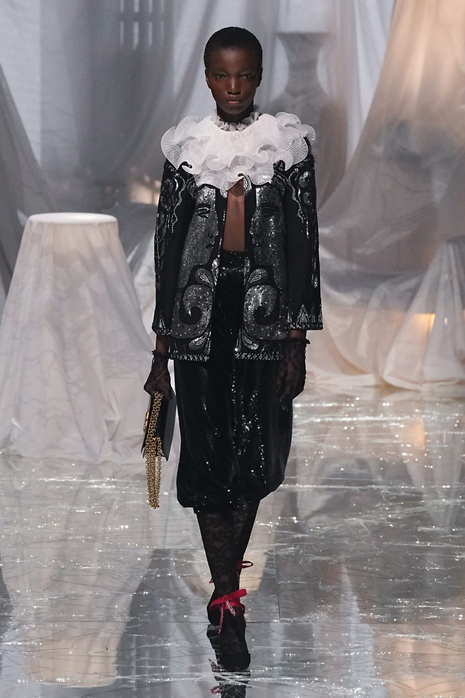 미켈레의 발렌티노 첫 런웨이 데뷔 컬렉션은 구찌 시절 미켈레 특유의 긱 시크(Geek-Chic)' 미학을 고급스러운 꾸띄르 렌즈로 해석한 부르주아 맥시멀리즘의 진수였다.