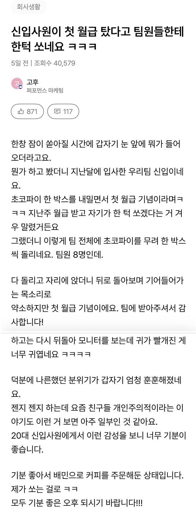 첫 월급 탔다고 팀원들한테 한턱 쏜 신입사원