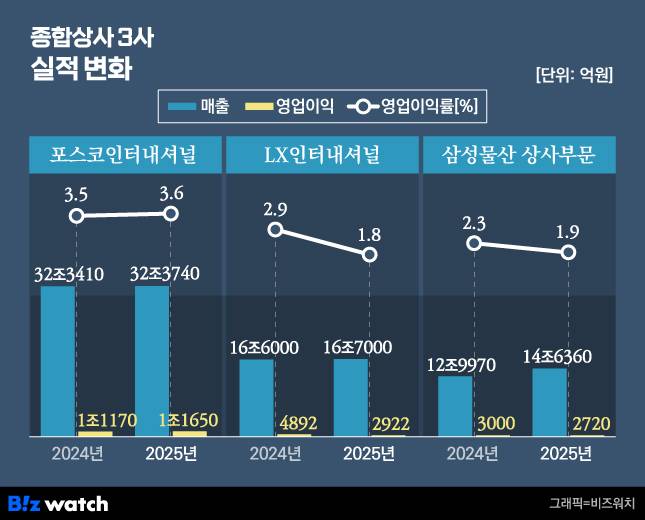 지난해 국내 종합상사들의 실적이 엇갈렸다. 포스코인터내셔널은 매출과 수익성을 동시에 끌어올린 반면, 삼성물산 상사부문과 LX인터내셔널은 양호한 매출을 수익성이 따라가지 못하면서 실속을 크게 챙기지 못했다.