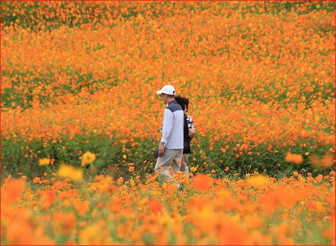 들꽃정원 구절초의 담백함 뒤에는 백일홍과 황화코스모스가 물결 모양으로 이어집니다. 올해는 색 띠를 더 선명하게 배치해서, 마치 동화책 속 크레파스를 꺼내 둔 듯한 장면이 펼쳐져요.