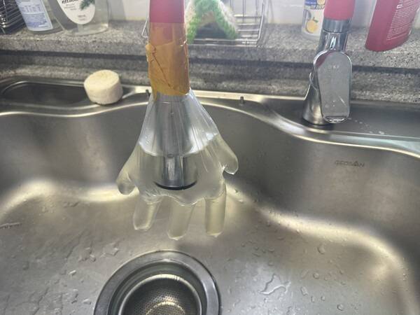 비닐장갑을 뒤집어 수전 끝부분에 씌웁니다. 손가락 부분이 수전 끝을 완전히 감싸도록 조정하세요.