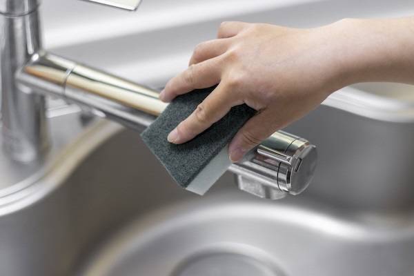먼저 수전 표면을 식초나 베이킹소다로 닦아 물때와 오염을 제거합니다. 마른 천으로 물기를 완전히 닦아주세요.