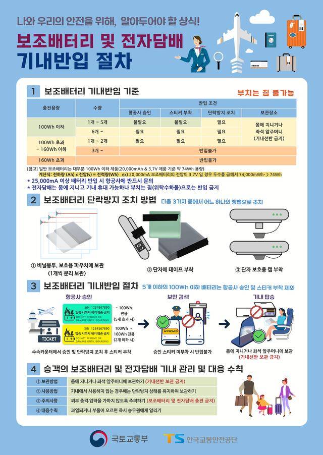 국토교통부는 여객기 내 보조배터리 화재에 관한 국민 불안감이 커짐에 따라 최근 ‘보조배터리 및 전자담배 기내 반입 표준안’을 마련했다. 항공기 탑승객은 보조배터리를 위탁수하물로 맡길 수 없고 직접 소지해야 한다. 이때 단락 방지 조치를 꼭 해야 하는데, 항공사 체크인 카운터에서 단락 방지법이나 보조배터리 용량에 따른 기내 반입 가능 여부를 확인할 수 있다. 모바일 탑승권을 가진 승객은 출발장 앞 안내데스크에 문의하면 된다.